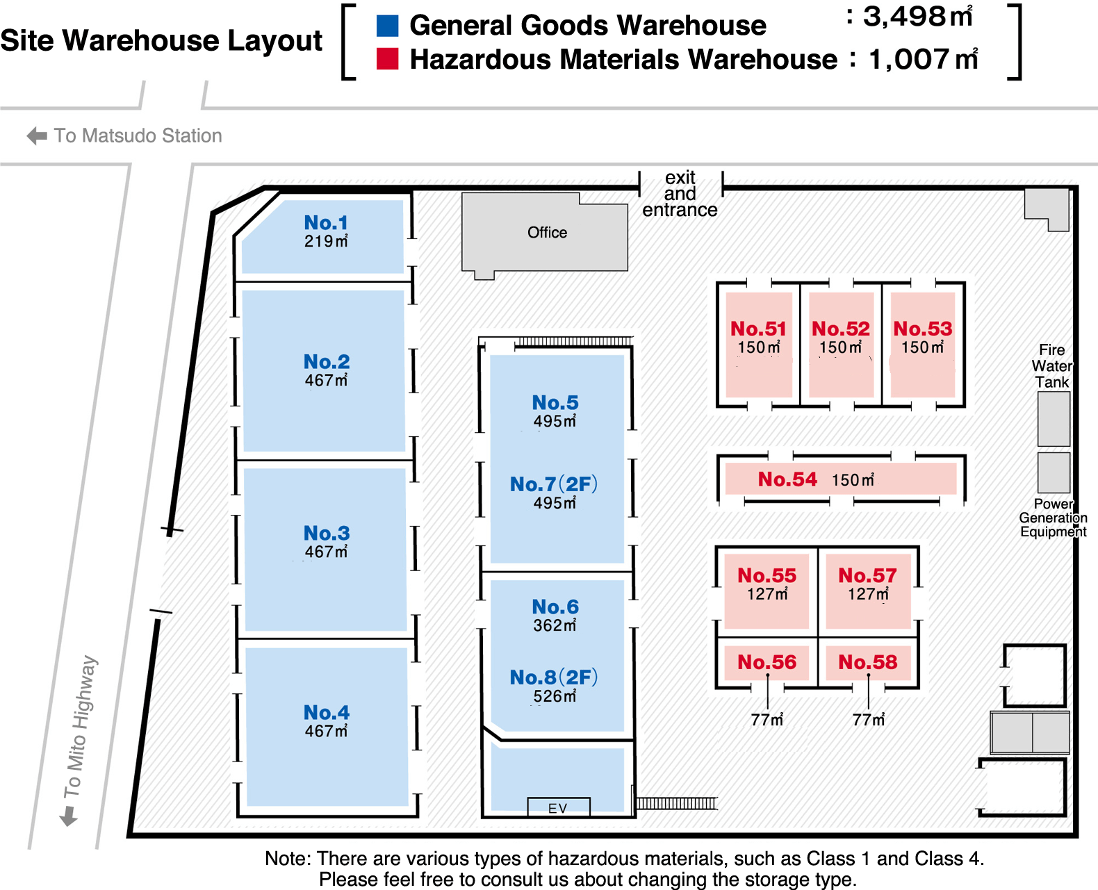 01Ceiling height of over 6 meters, with a maximum floor load of approximately 3 tons per square meter.The Matsudo Sales Office, located on a site of approximately 8,265 square meters at the southwest corner of the Kitamatsudo Industrial Park, prioritizes ease of use and efficiently arranges both general goods warehouses and hazardous materials warehouses.